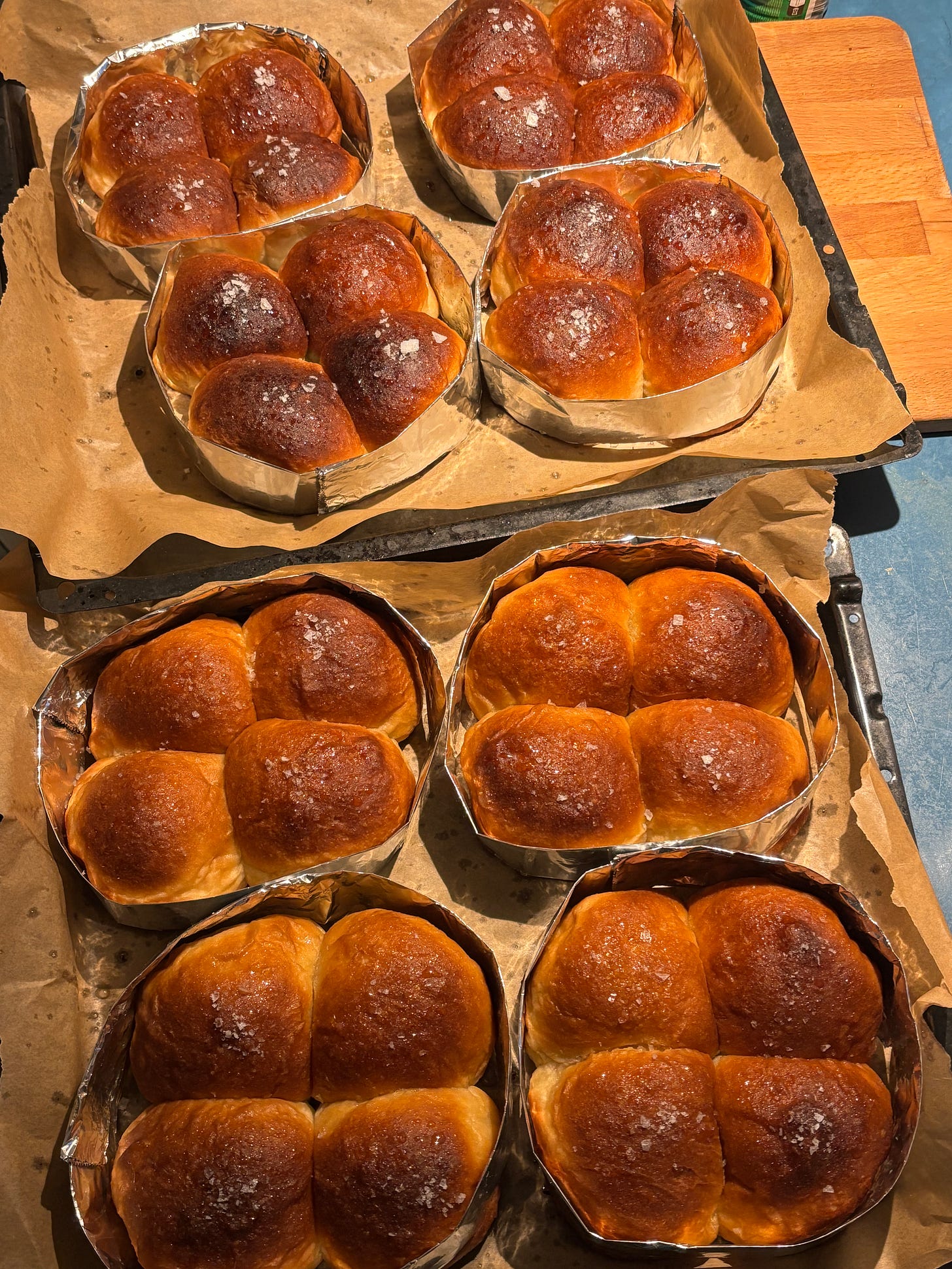 Die Kugeln auf ein mit Backpapier ausgelegtem Blech verteilen, dabei eine kleine Lücke zwischen ihnen lassen. Dann nochmal an einem warmen Ort gehen lassen, bis sie sich fast verdoppelt haben. Zwischendrin dann auf 200 Grad Umluft/ 220 Grad Ober-Unterhitze vorheizen. Die Buchteln vor dem Backen mit einer Mischung auf Olivenöl und Agavensirup einstreichen und ca 15-20 Minuten backen, bis sie goldbraun sind. Direkt nach dem Backen nochmal mit der Sirup-Öl-Mischung einstreichen, damit die Oberfläche nicht austrocknet, sondern weich bleibt. Dann mit Meersalzflocken bestreuen und genießen!